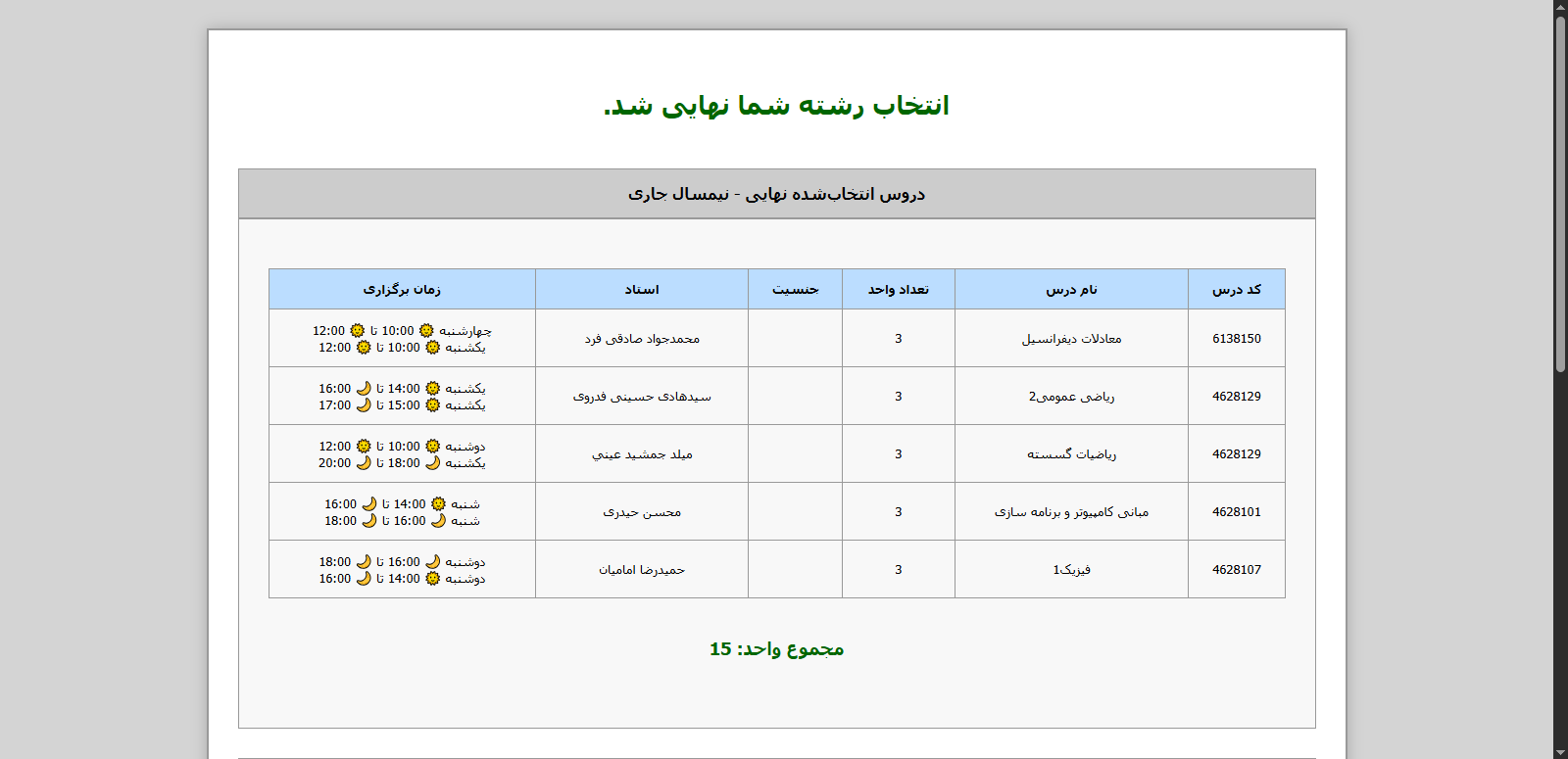 نمونه ای از صفحه در انتخاب واحد با زمان محدود: