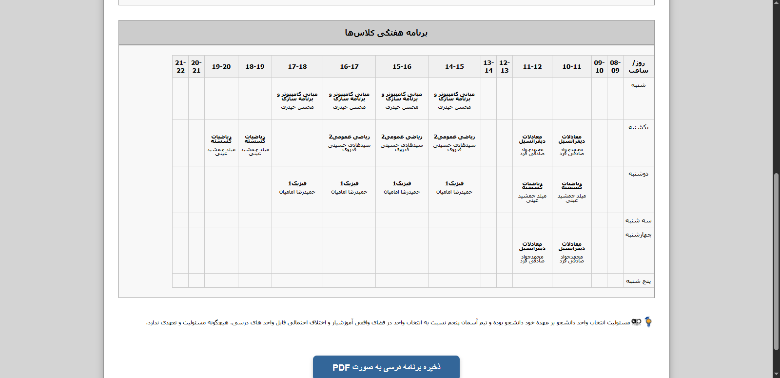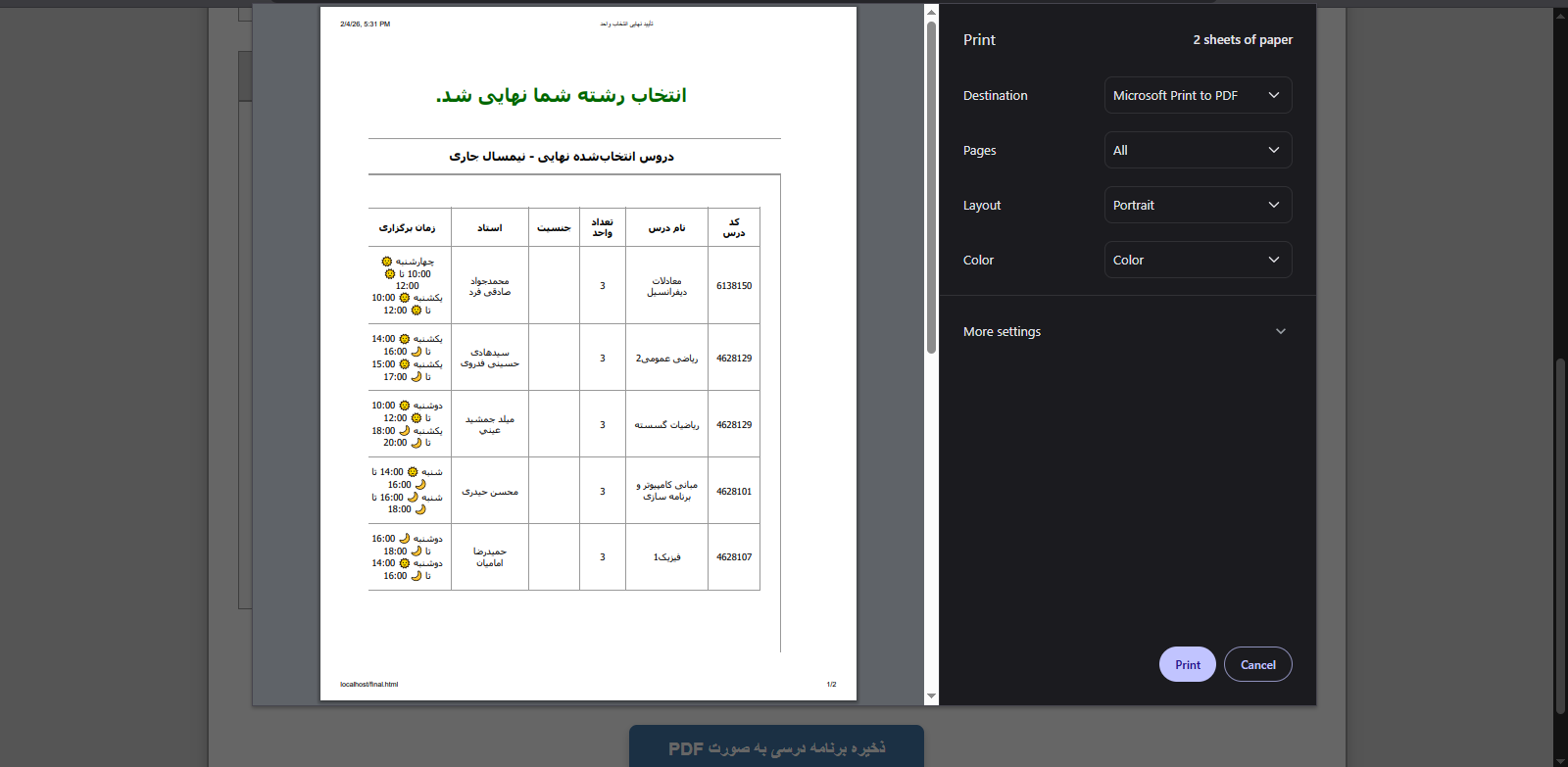 و پس از کلیک بر روی دکمه ثبت ، وارد صفحه چاپ می شوید که به شما برنامه هفتگی هم نمایش داده می شود. و می توانید پی دی اف دانلود شده یا چاپ شده را با دوستان خود به اشتراک بگذارید